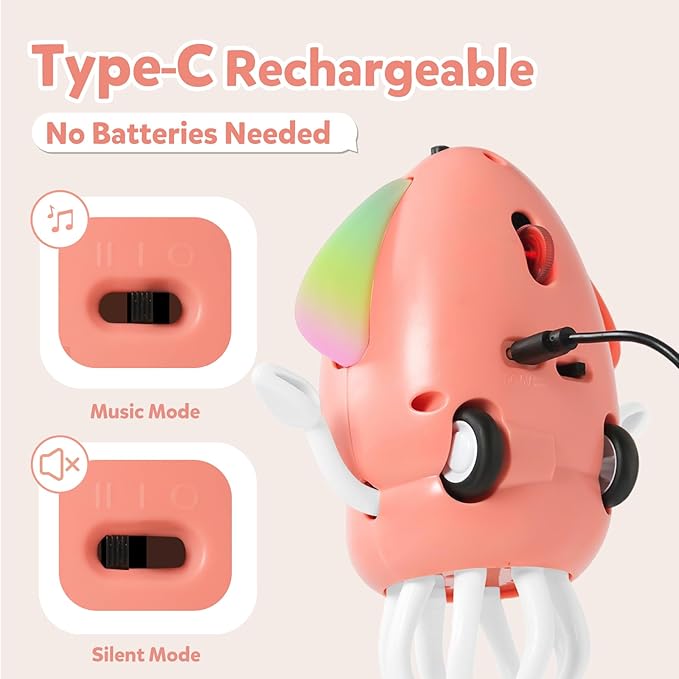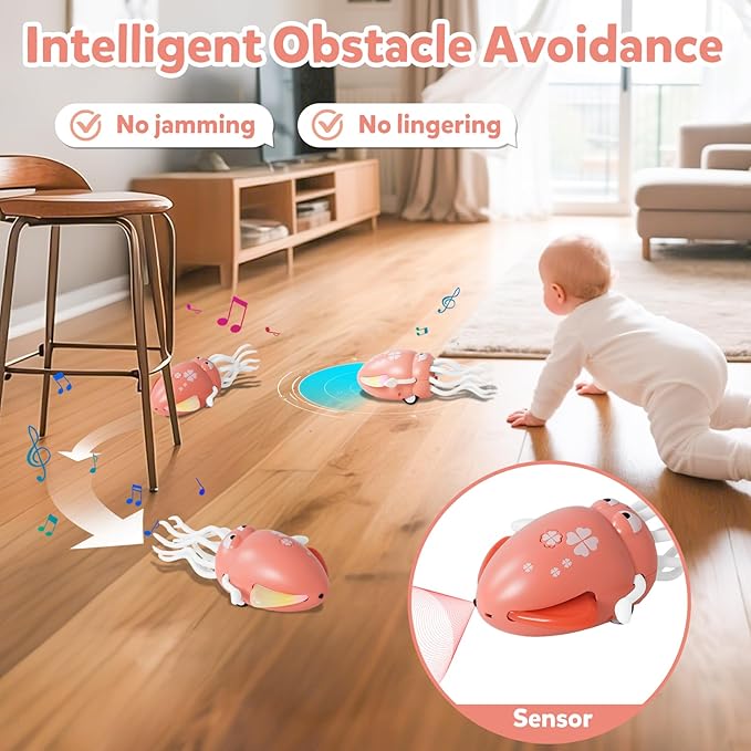 - RECHARGEABLE & AUTO OBSTACLE: Includes a quiet mode (music off) and is Type-C rechargeable. This electric crawling octopus toy has a built-in intelligent sensor to detect and bypass obstacles, helping it stay safe and keep the fun going. It automatically turns and changes direction to attract children's attention and encourage them to crawl along