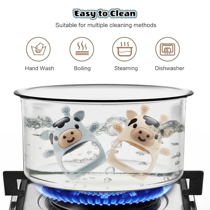 - Adjustable Design: The cute cow shape is a hit with babies. Plus, the teether mitten is easily adjustable to fit your baby's hand size. Tightening prevents it from falling off, while loosening offers maximum flexibility