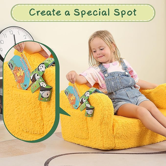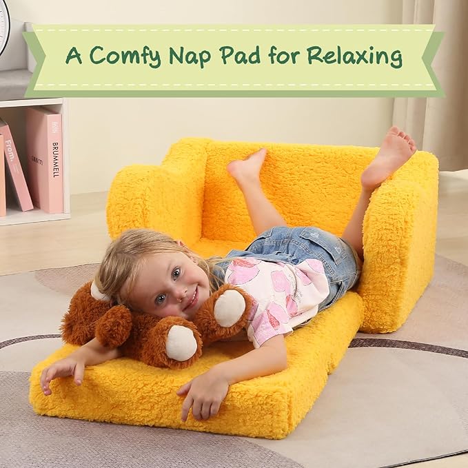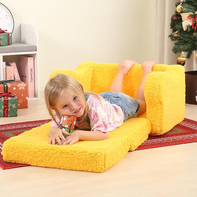Kids Chairs for Toddler, 2-in-1 Toddler Soft Sherpa Couch Fold Out, Convertible Sofa to Lounger for Girls and Boys, Halloween Decor, Yellow