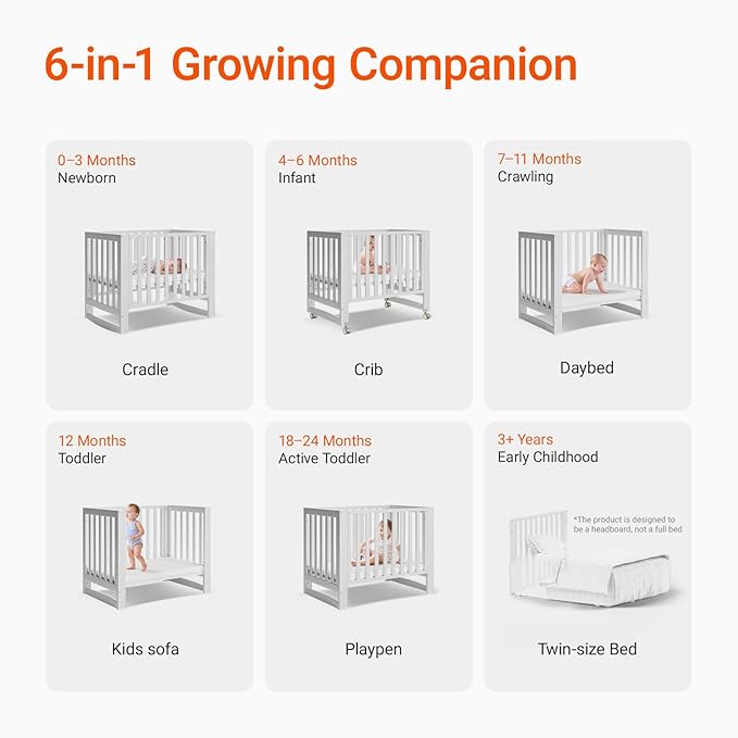 - Evonest‘s by Mamazing 6-in-1 Convertible Crib that Grows with Baby: Transitions from baby crib to cradle, playpen, mini sofa, daybed, and even a twin-size bed as your little baby grows. Includes easy-to-follow instructions for hassle-free assembly.
