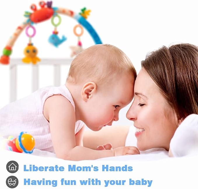 - Carseat toys for infants 3-6 months,Stroller toys have variety of graphics,cloud with a bell.BB squeaker in the crab,press to make a Bi~ Bi~ sound.Fish has colorful rotating ball.