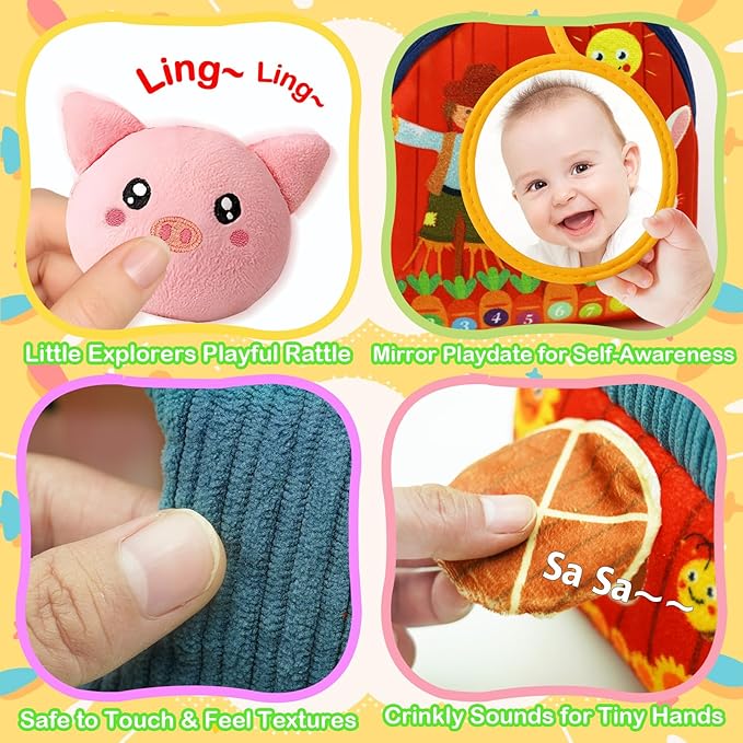 - MULTI-SENSORY DISCOVERY: Each soft animal hides surprises like crinkle paper, squeakers, or rattles. By pressing, shaking, and grasping, babies strengthen hand-eye coordination while discovering new sounds. The barn doors and windows crinkle when opened, and a mirror adds engaging visual stimulation for self-recognition and focus.