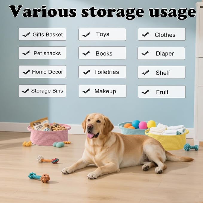 - 【Multi-Purpose Storage】Woven baskets for storage,bathroom organization, shelf styling,storage basket for organizing snacks, dog cat, magazine, shoes, remotes, books, towels, toiletries, keys and more.Widely used in living room,bedrooms,bathrooms,kids room,and Kitchen.