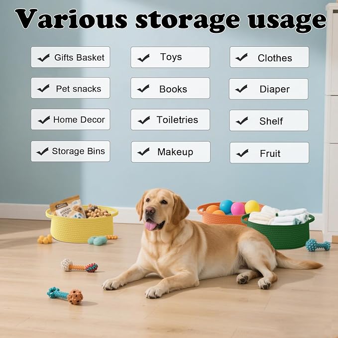 - 【Multi-Purpose Storage】Woven baskets for storage,bathroom organization, shelf styling,storage basket for organizing snacks, dog cat, magazine, shoes, remotes, books, towels, toiletries, keys and more.Widely used in living room,bedrooms,bathrooms,kids room,and Kitchen.