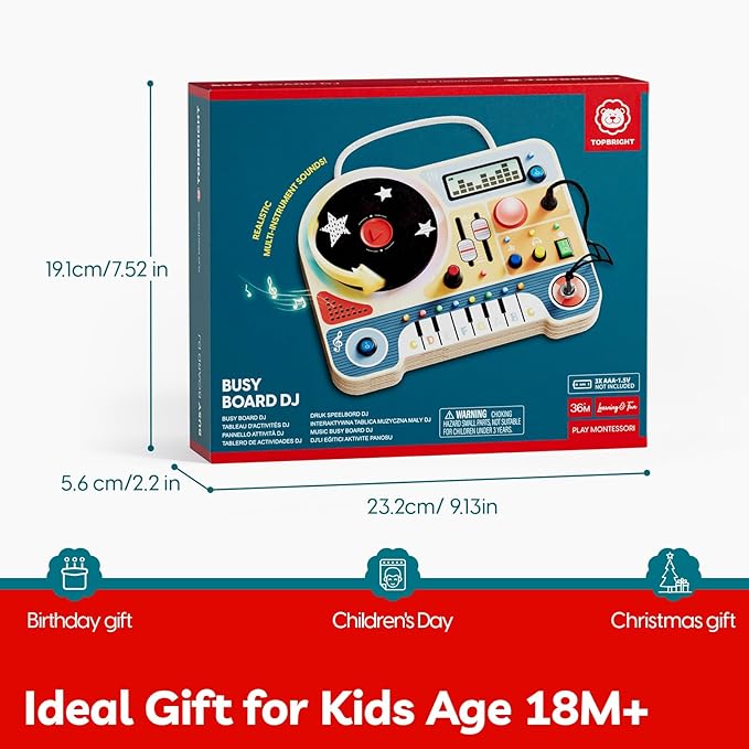 TOP BRIGHT DJ Busy Board with LED Light, Wooden Toddler Toys for 3 Year Old Boys and Girls, Montessori Sensory Toy with 6 Classic Songs 4 Sound Effects, Portable Travel Toy for 36M+