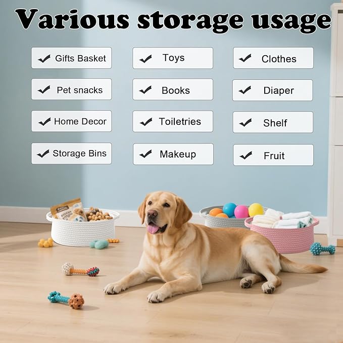 - 【Multi-Purpose Storage】Woven baskets for storage,bathroom organization, shelf styling,storage basket for organizing snacks, dog cat, magazine, shoes, remotes, books, towels, toiletries, keys and more.Widely used in living room,bedrooms,bathrooms,kids room,and Kitchen.