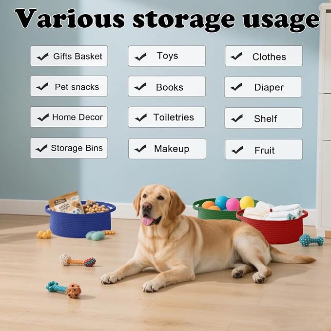 - 【Multi-Purpose Storage】Woven baskets for storage,bathroom organization, shelf styling,storage basket for organizing snacks, dog cat, magazine, shoes, remotes, books, towels, toiletries, keys and more.Widely used in living room,bedrooms,bathrooms,kids room,and Kitchen.
