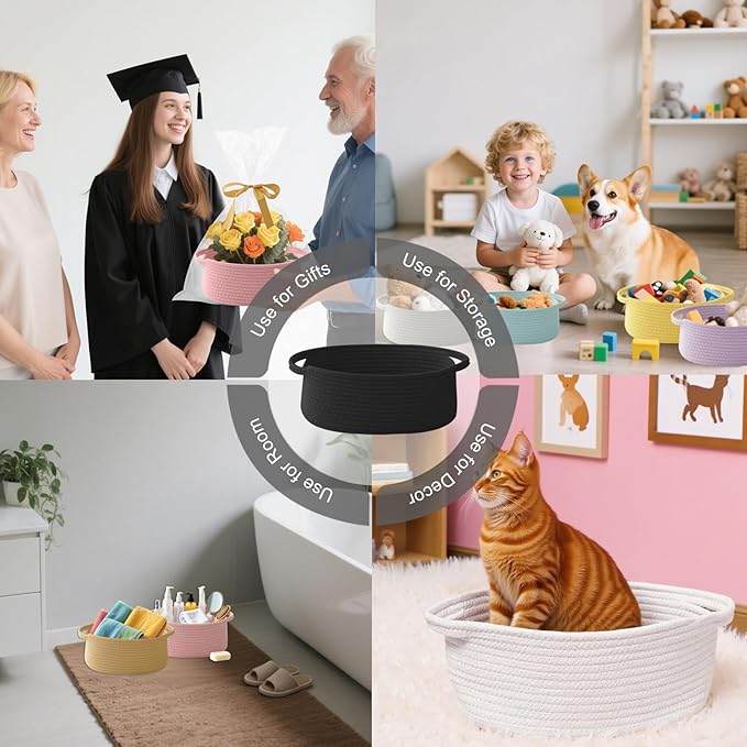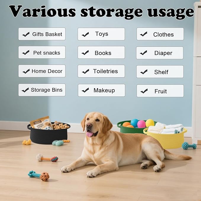 - 【Multi-Purpose Storage】Woven baskets for storage,bathroom organization, shelf styling,storage basket for organizing snacks, dog cat, magazine, shoes, remotes, books, towels, toiletries, keys and more.Widely used in living room,bedrooms,bathrooms,kids room,and Kitchen.
