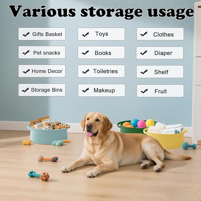 - 【Multi-Purpose Storage】Woven baskets for storage,bathroom organization, shelf styling,storage basket for organizing snacks, dog cat, magazine, shoes, remotes, books, towels, toiletries, keys and more.Widely used in living room,bedrooms,bathrooms,kids room,and Kitchen.