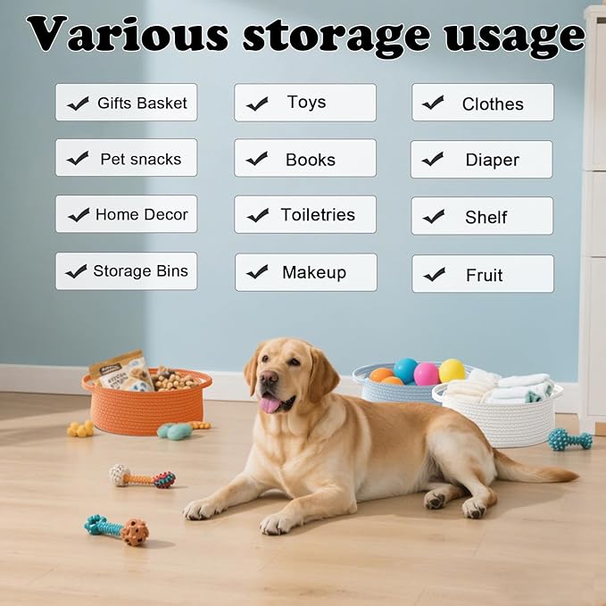 - 【Multi-Purpose Storage】Woven baskets for storage,bathroom organization, shelf styling,storage basket for organizing snacks, dog cat, magazine, shoes, remotes, books, towels, toiletries, keys and more.Widely used in living room,bedrooms,bathrooms,kids room,and Kitchen.