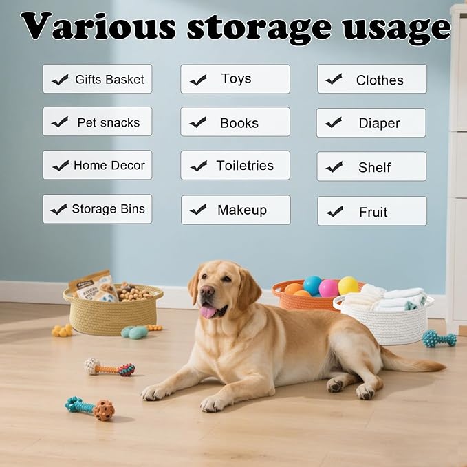 - 【Multi-Purpose Storage】Woven baskets for storage,bathroom organization, shelf styling,storage basket for organizing snacks, dog cat, magazine, shoes, remotes, books, towels, toiletries, keys and more.Widely used in living room,bedrooms,bathrooms,kids room,and Kitchen.