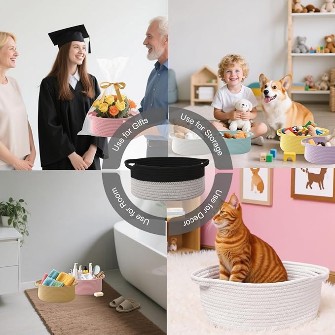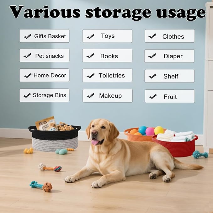 - 【Multi-Purpose Storage】Woven baskets for storage,bathroom organization, shelf styling,storage basket for organizing snacks, dog cat, magazine, shoes, remotes, books, towels, toiletries, keys and more.Widely used in living room,bedrooms,bathrooms,kids room,and Kitchen.