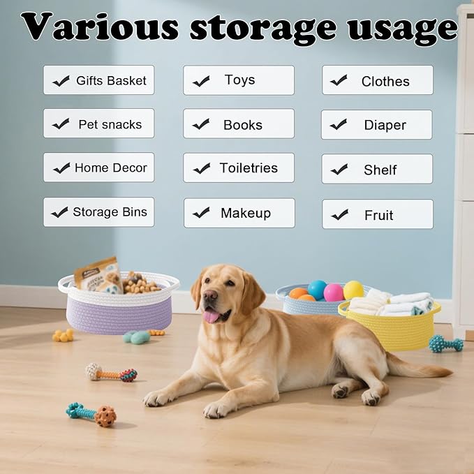 - 【Multi-Purpose Storage】Woven baskets for storage,bathroom organization, shelf styling,storage basket for organizing snacks, dog cat, magazine, shoes, remotes, books, towels, toiletries, keys and more.Widely used in living room,bedrooms,bathrooms,kids room,and Kitchen.