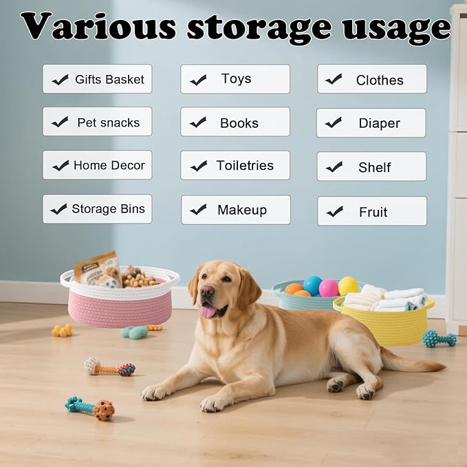 - 【Multi-Purpose Storage】Woven baskets for storage,bathroom organization, shelf styling,storage basket for organizing snacks, dog cat, magazine, shoes, remotes, books, towels, toiletries, keys and more.Widely used in living room,bedrooms,bathrooms,kids room,and Kitchen.