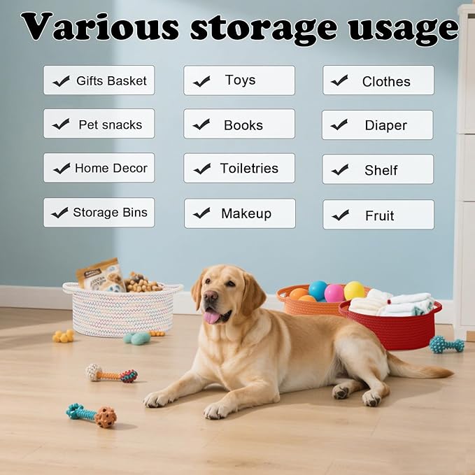 - 【Multi-Purpose Storage】Woven baskets for storage,bathroom organization, shelf styling,storage basket for organizing snacks, dog cat, magazine, shoes, remotes, books, towels, toiletries, keys and more.Widely used in living room,bedrooms,bathrooms,kids room,and Kitchen.