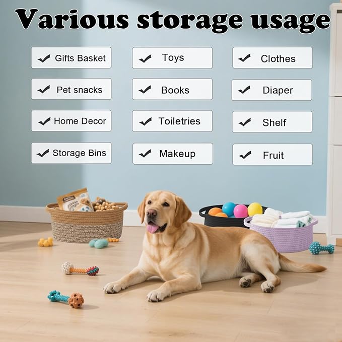 - 【Multi-Purpose Storage】Woven baskets for storage,bathroom organization, shelf styling,storage basket for organizing snacks, dog cat, magazine, shoes, remotes, books, towels, toiletries, keys and more.Widely used in living room,bedrooms,bathrooms,kids room,and Kitchen.