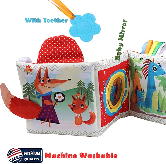 - Tummy Time Toys with Mirror: This is a double-sided soft book featuring six unique panels. One side showcases black and white high-contrast illustrations, perfect for newborns aged 0-6 months as they are naturally drawn to bold patterns, supporting early visual and pattern recognition. The reverse side offers colorful illustrations designed for the next stage of development, when your babyโs vision matures, and they can fully recognize and enjoy vibrant colors.