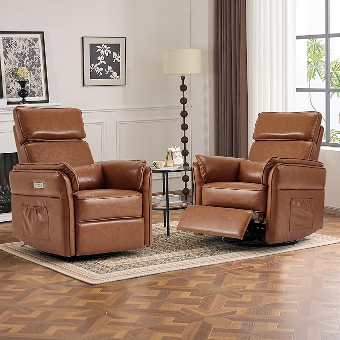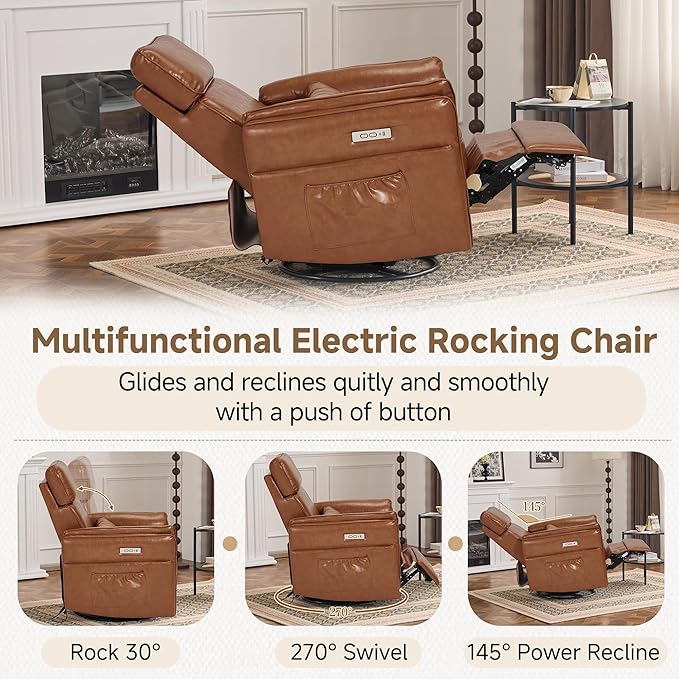 Power Recliner Rocking Chair Nursery Gliders with Adjustable Armrests and Headrest, Swivel Electric Glider Reclining Nursing Chair with USB Port and Storage Bags, FSC Certified(Leather, Brown)