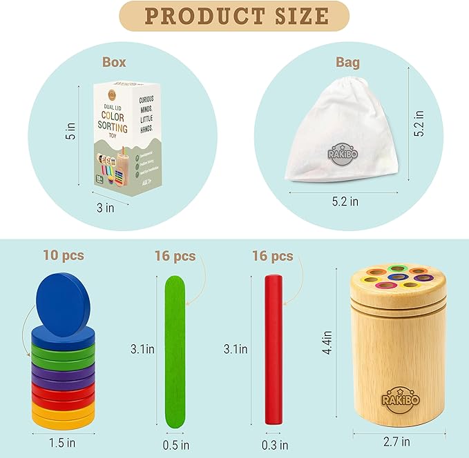 - Hands-On Early Learning – Includes a wooden cylinder with 3 interchangeable lids, 16 colorful sticks, 16 popsicle sticks, and 10 discs. Encourages color recognition, spatial skills, logic, imagination, and fine motor development with every play.