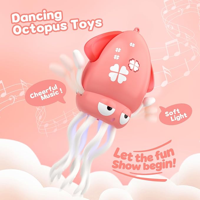 - Dancing Octopus Baby Toy: This crazy dancing octopus toys can wiggles, spinner, and crawls like a real squid. With colorful lights and adjustable music it can encourage babies to walk and crawl which perfect for active kid's play and early sensory development. It has sensors that reverse its direction when it nears an obstacle, enhancing the fun factor and make the crawling more prolonged.