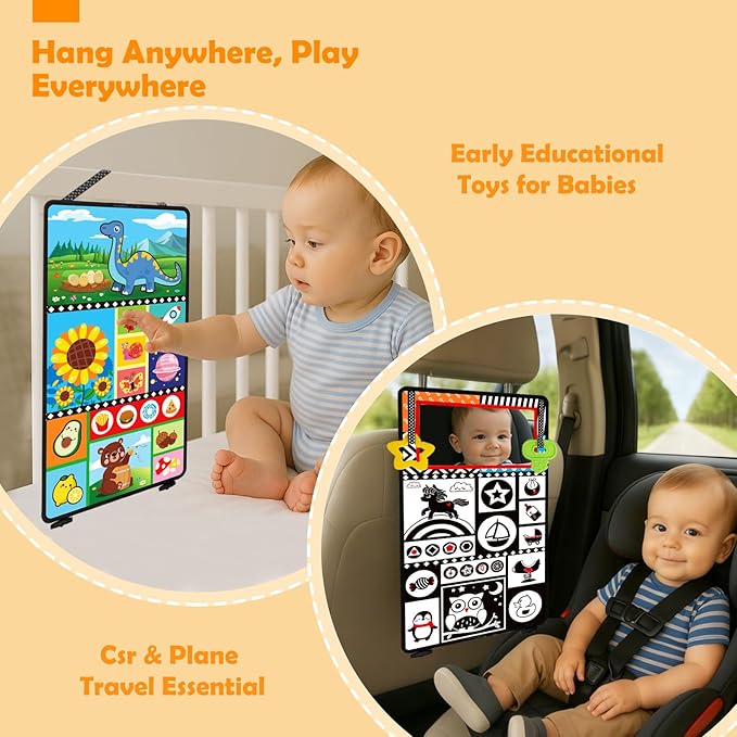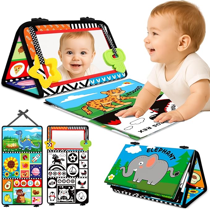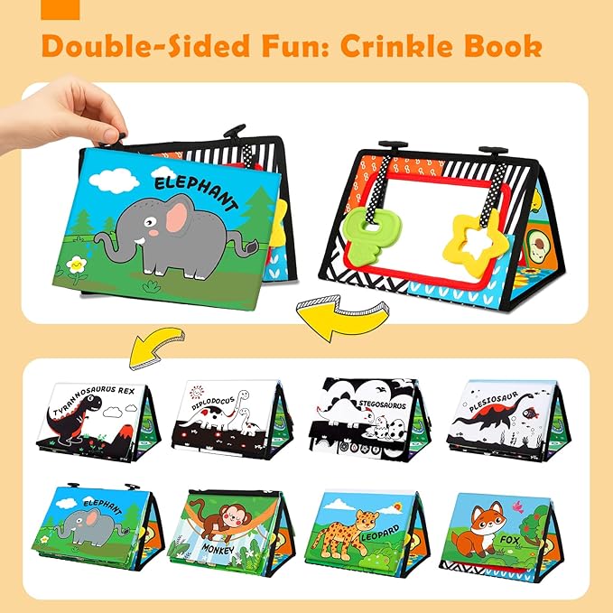 - Baby Sensory Crinkle Toy Book: Soft cloth book features 4 pages (8 sides) with adorable animal designs and high-contrast illustrations. Each page contains engaging crinkle paper to stimulate your baby's senses and and spark natural curiosity. Uniquely designed to unfold into a play mat, it also comes with secure buckles for attaching to a mirror. It promotes tactile exploration, auditory development, and early cognitive skills