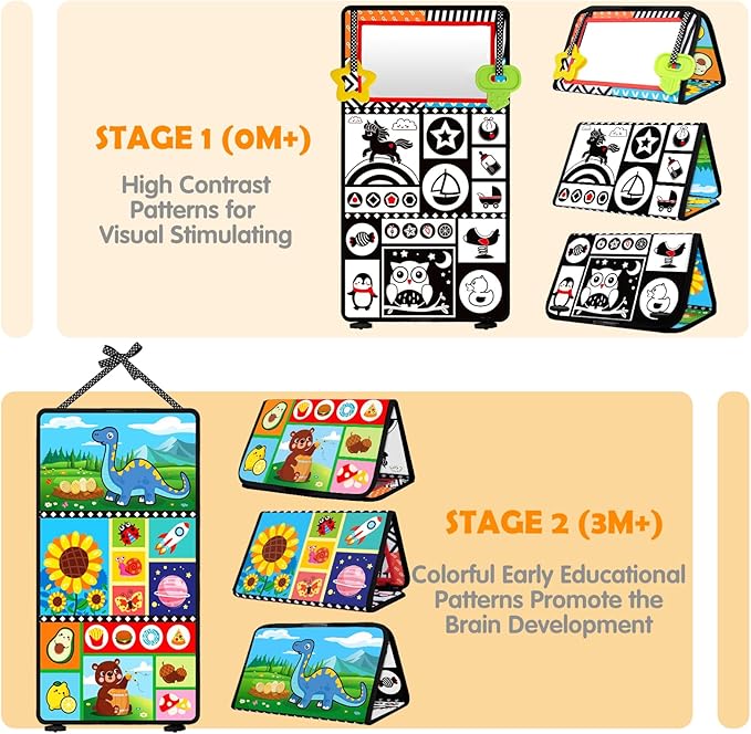 - Educational Toys for Brain Development: This tummy time toy is suitable for babies aged 0-12 months. The high contrast black and white patterns are perfect for newborns (0-3 months), capturing their attention and supporting early visual development. For babies over 3 months, the colorful patterns stimulate their growing senses and encourage motor skill development