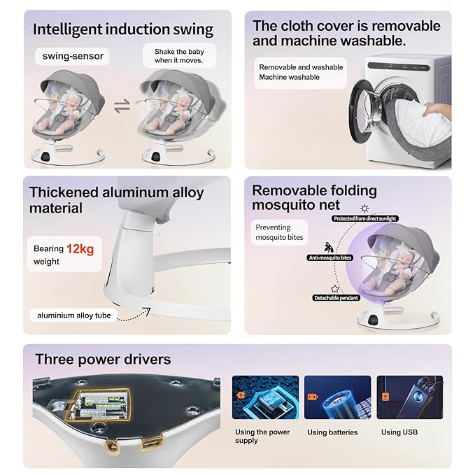 - Smart Auto Swing:Smart motion sensor adjusts rocking intensity based on baby’s movements, mimicking a parent’s sway.5 adjustable swing speeds,3 recline positions,3 timer settings (8/15/30 min) for playtime, or feeding