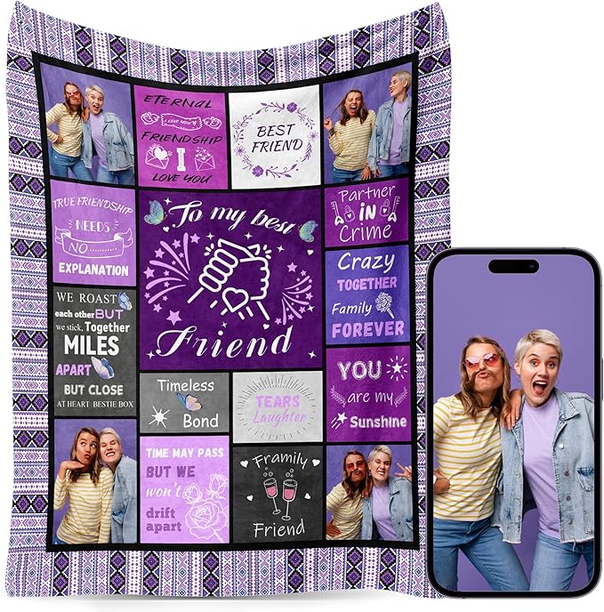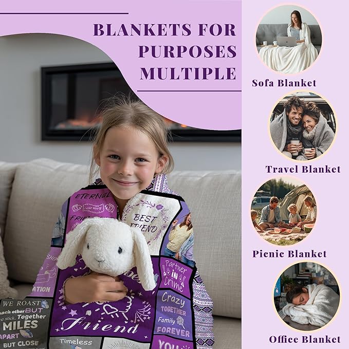 BFF Best Friend Custom Personalized Blanket Thow Gifts with Photo, Customized Pictures Blankets Gift for Sister Women Girls Christmas Birthday (Purple Grid Friend)