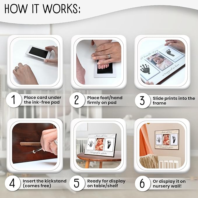 - NO HASSLE, NO MESS BABY KEEPSAKE - With lovely designs you can choose from, built-in acrylic cards to insert the prints to, a printed photo of your baby, no-mess inkpads for baby hand and footprints, this is the easiest way to capture your babyโs adorable prints forever. It comes with 4 print cards and 4 safe, no-mess ink pads, so you can try to get the perfect print more than once!