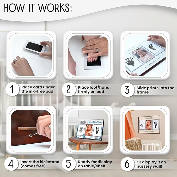 - NO HASSLE, NO MESS BABY KEEPSAKE - With lovely designs you can choose from, built-in acrylic cards to insert the prints to, a printed photo of your baby, no-mess inkpads for baby hand and footprints, this is the easiest way to capture your babyโs adorable prints forever. It comes with 4 print cards and 4 safe, no-mess ink pads, so you can try to get the perfect print more than once!