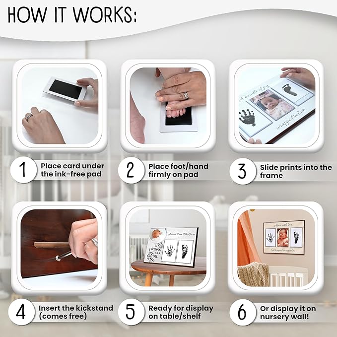 - NO HASSLE, NO MESS BABY KEEPSAKE - With lovely designs you can choose from, built-in acrylic cards to insert the prints to, a printed photo of your baby, no-mess inkpads for baby hand and footprints, this is the easiest way to capture your babyโs adorable prints forever. It comes with 4 print cards and 4 safe, no-mess ink pads, so you can try to get the perfect print more than once!