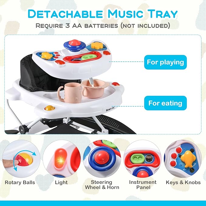 - 【Interactive Activity Center】 With rotary balls, lights, steering wheel and horn, instrument panel, keys and knobs, the activity tray adds an element of fun to the walking experience. Note: require 3 AA batteries (not included). Besides, after removing the music box can be turned into a walker with food tray for baby’s meals.