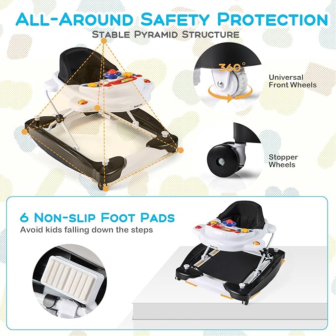 - 【All-Around Safety Protection】 This ASTM & CPSIA certificated baby walker features 6 anti-slip pads (auxiliary brakes) to eliminate the risk of falling down stairs or rolling down slopes. With a safety distance reserved between the front of the walker and the wall, it prevents finger pinching for a safe world exploration. The universal front wheels provide flexible and smooth steering, while the speed-reduction rear wheels ensure safe control.